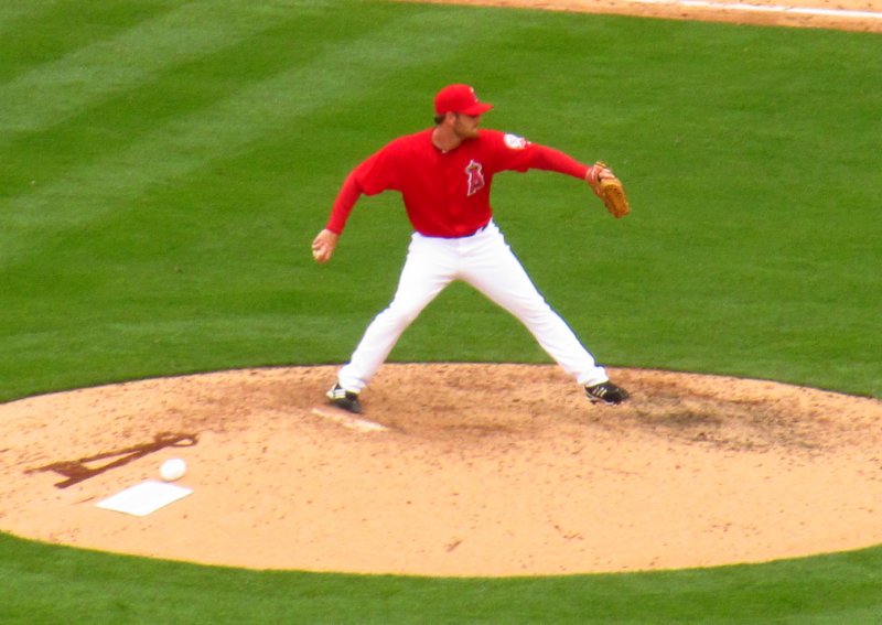Jordan Walden is one of my favorite "kids", a relief pitcher who came up from SLC last year. Throws in the triple digits, WITH lots of movement, and is fearless. Look at the reach in this photo, and how far ahead his upper body is - no wonder he has velocity.