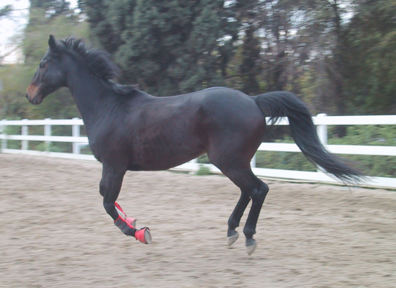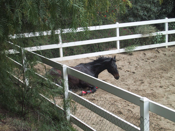 A video of Pirate being his silly racehorse self in a turnout after a long winter rain in January of 2005, accompanied by his noisy little friend Flash the Terrier, at our old barn in Sunland. This is my first attempt posting video to the web, and its not very good, but you get the idea. He did love to to run and I always laughed at his big "come chase me!" SNORT at the end.