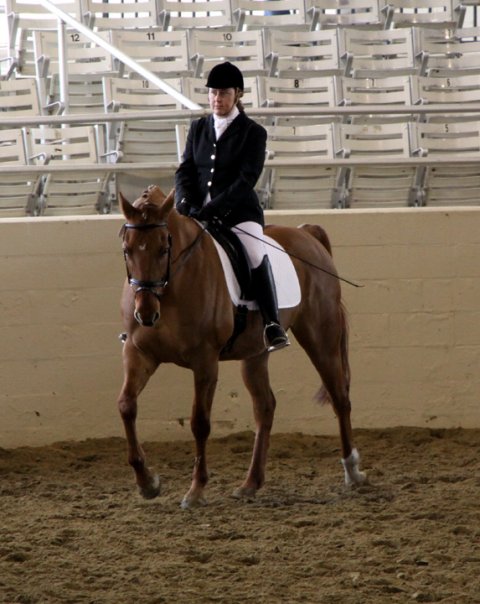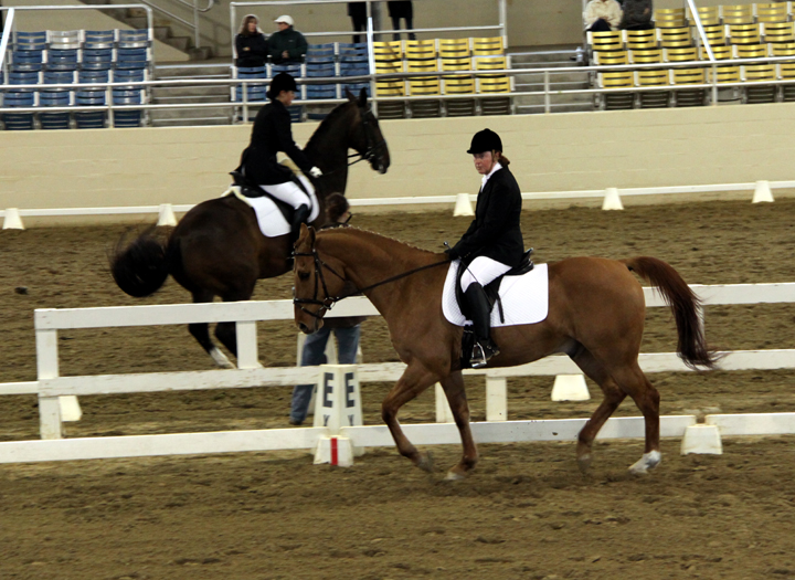 Flush from our success at the December show, I decided we could do the whole two days with an overnight stay. Not sure why I ever worried about my boy - he's a fantastic traveller and camper, settles in (if there is food, he considers it home) and doesn't get frazzled by anything. My greatest concern at this show was the rain that fell all day and night before, which closed all arenas for warmup except the tiny area leftover in the dome...which was full of overstimulated, huge, hyper warmbloods all Behaving Badly. Our warmup essentially involved walking around and trying not to get killed. But Punkin was a total pro, cruised through both tests both days, with scores in the high 60's!